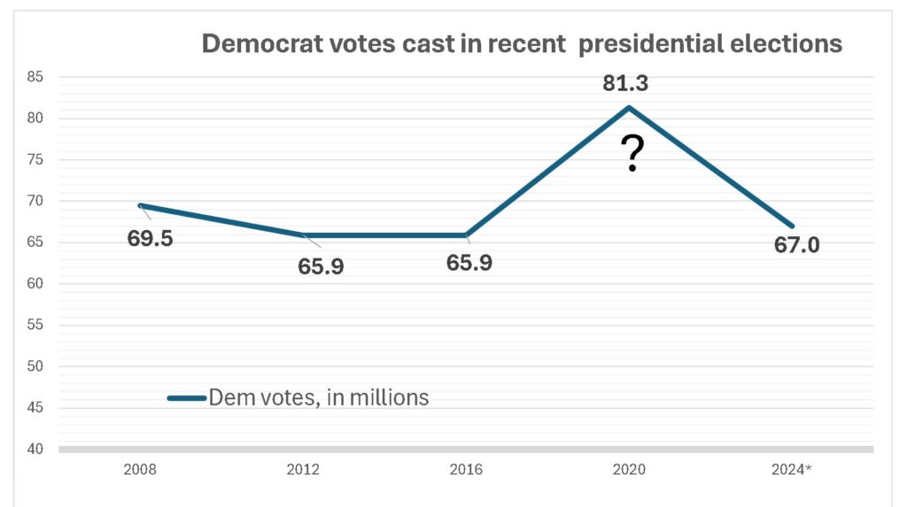 This side effect of COVID isn’t listed anywhere in any research I’ve seen, so I’m guessing something else was responsible. Racism is a disease, right? Those racist Dems sure liked that old white guy a lot better than either of those younger people of color. At least ten million plus Democrat racists, by the look of it. That’s a lot. Voting team blue. For the old white dude that none of them liked enough in any previous election where he ran for president to even cast a primary ballot for him. I don’t believe he ever got more than 4% of any Democrat vote.
