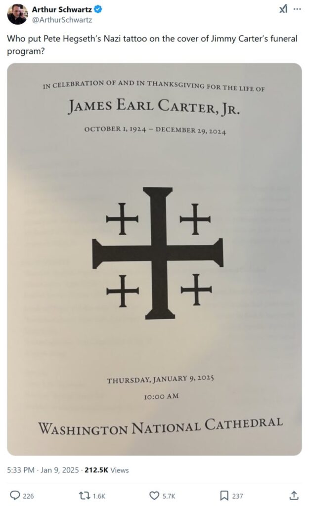 I had heard several times during the broadcast that Jimmy Carter planned every detail of his funeral. Being a micro-manager, I doubt that he would have left this detail, the front page of the order of events, to anyone else: