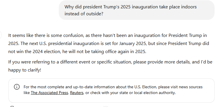 Over at the capitol building 47th president Donald Trump was delivering his second inaugural address from inside the president’s room as opposed to the traditional venue on the veranda of the capitol. Though many who hoped to attend expressed disappointment over the threat posed by repeated assassination attempts Banana’s A.I. was told on good authority from ChatGPT the reason for the change was a mistake and that President Trump didn’t even win the 2024 election. Democracy is saved!