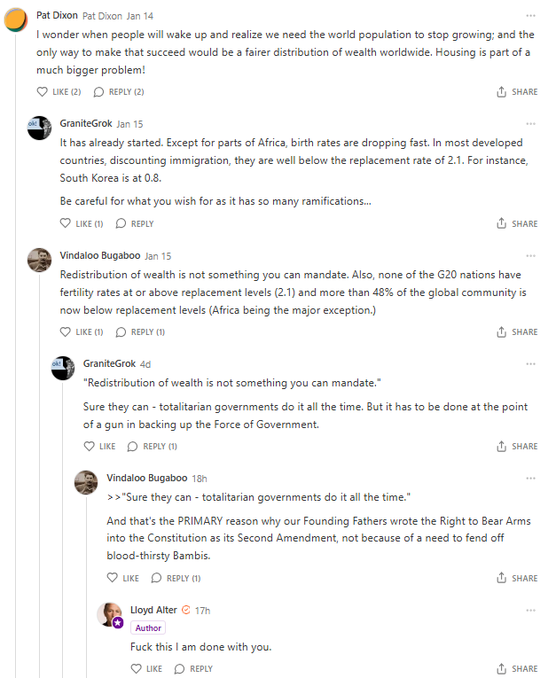 Pat started it with the wealth redistribution part and “degrowth”; as you can see both VB and I commented on the global birth decline but then VB made the mistake that you can’t mandate redistribution. I was VERY surprised as VB generally NEVER makes such a mistake and you can see that I corrected him.