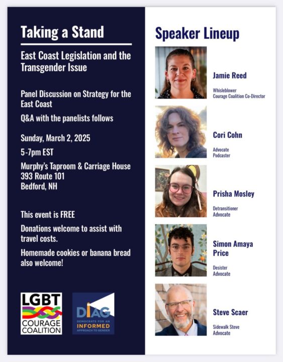 Gender-clinic whistleblower Jamie Reed, detransitioner Prisha Mosley, advocate and podcaster Cori Cohn (Heterodorx), and desister Simon Amaya Price will testify in support of bills HB377, which protects children from puberty blockers and cross-sex hormones, and HB712, which limits breast surgeries for minors. The House Health and Human Services will hold hearings for both these bills on Monday, March 2.