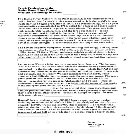 We also sent the material to build the world’s largest truck engine factory at the time, the Kama River factory, in Russia. Engines from these trucks came in handy when the Soviets invaded Afghanistan. This gem comes right from the CIA’s website.