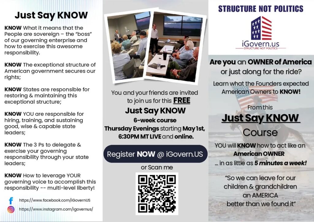 Just Say Know is a 6-week course backing YOU with the structure that our Constitutional Republics provide. All elected and appointed public servants are expected to know and live out both the NH and US Constitutions YET no constitution course nor foundation is provided.