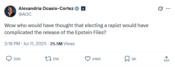 She called “him” a rapist, which is what cost ABC News and former Clinton insider George Stephanopolis sixteen million dollars, more if they had not agreed to settle. It’s one of those few and far between ” not protected speech” even when directed at the most public person on the planet, things. And it’s from her personal account, not her political one, as if the two could be separated. Dems are incapable of separating politics from anything unless it suits some political goal. The person doing business as AOC said it. Team Trump has yet to weigh in, but it is likely not worth the bother.