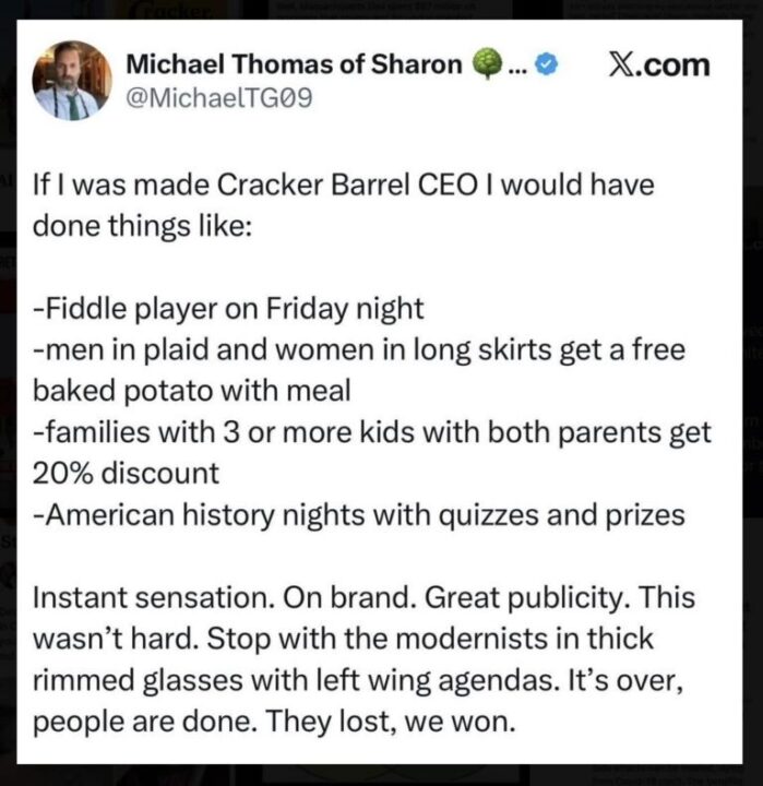 Welcome to Wednesday, not the Netflix Season Two Addams Family-style spin-off starring Jenna Ortega (I liked Season One, but haven’t seen Season Two yet). I’m referring to the middle of the workweek, Wednesday, which means memes! Lots of memes. We also have some Cracker Barrel memes, even though the company caved and then backtracked last night (to all the meme pressure?), saying it would not change its branding.