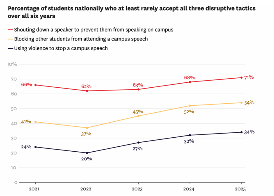 “The atmosphere isn’t just cautious — it’s hostile. Students continue to show low tolerance for controversial speakers, and troublingly, more believe it’s acceptable to shout down a speaker, block access to events, or even resort to violence to silence campus speech than ever before.”