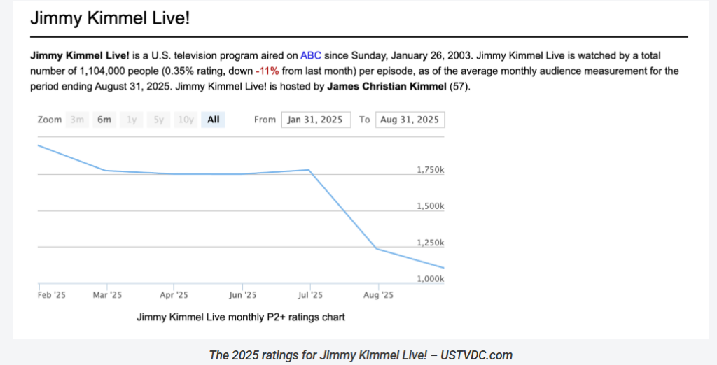 Jimmy Kimmel was shedding viewers like mad before his comments about Kirk and his shooter. Maybe it was a summer slump, or perhaps the world was getting tired of him. He’s not that interesting, and you have to stay up late to watch a pre-recorded show called Jimmy Kimmel Live, which was taped what, eight hours earlier?