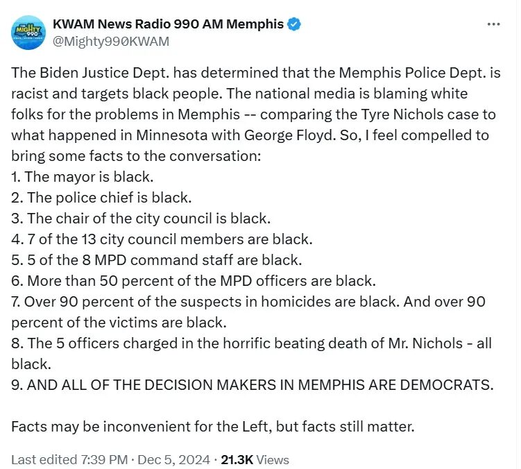Memphis, the home of the blues, is a Black majority city run by blacks with a black-on-black crime problem, … not because of black people but because of Democrat people.