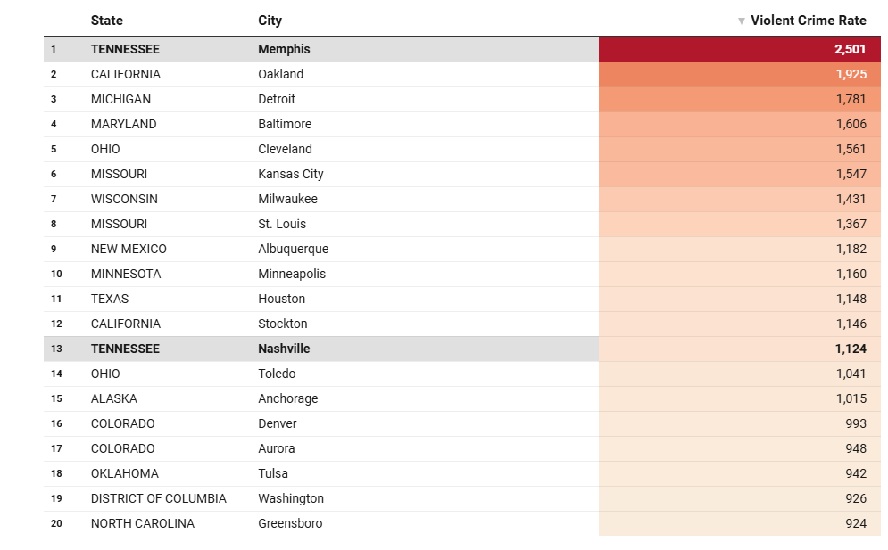 In 2023, crime in Memphis was higher than in 99.7% of all US cities. 2023 was the year Tyre Nichols was beaten to death by individuals from the MPD SCORPION Unit, some of whom were hired off the street and fast-tracked to fill gaps created by Democrats’ bowing to the 2020/2021 BLM defund movement.
