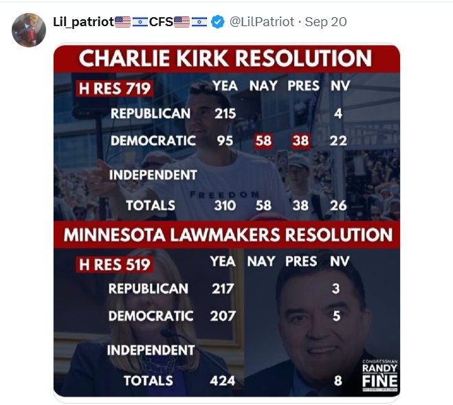 When Congress approved a resolution honoring Democrat Melissa Hortman and condemning political violence, every Republican voted for it in a unanimous roll call vote. For a similar resolution honoring Charlie Kirk, fifty-eight Democrats voted No, another thirty-eight voted Present, and twenty-two more didn’t vote. Seriously, what’s driving this? Their consciences or their constituents? Neither answer is comforting.