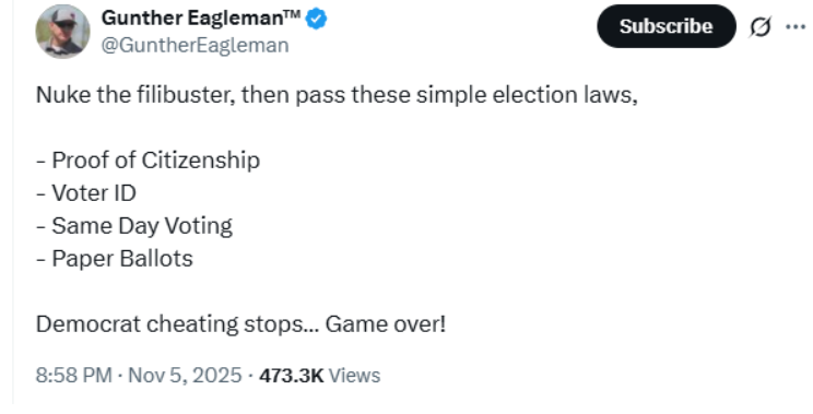 …a bold, foolproof strategy to save America from the clutches of the Deep State lowlifes and ensure they never regain control. This isn’t just a good idea; it’s the absolute best move we can make right now, stripping away every possible counterargument while delivering a knockout blow to corruption. Here’s how it works: President Trump should champion a temporary suspension of the filibuster, but with ironclad restrictions—lifting it solely to pass comprehensive election reform legislation, as outlined by Gunther Eagleman in his powerful X post below.