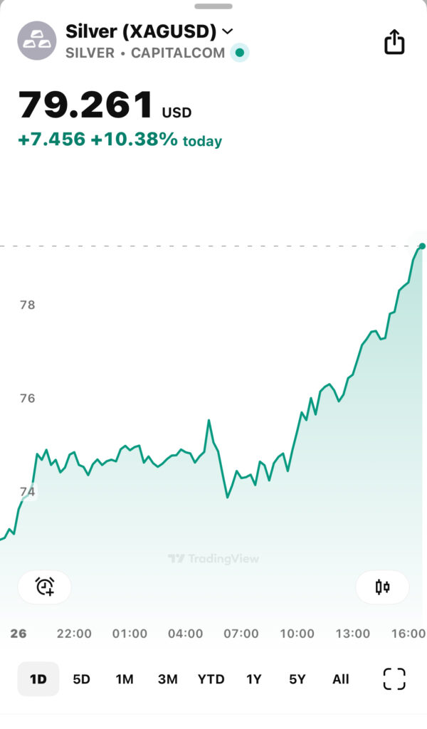 The Silver market took an unprecedented run UP on Friday. The market went up OVER TEN PERCENT IN ONE DAY, to close for the weekend at $79.26. Up $7.45. That’s EPIC! It did NOT chart with gold, as it usually does, which went up just over one percent of its value on Friday. The silver percentage increase of over 10% in one day deserves attention. Its ratio with gold has been off for years, so this separation of charting with gold wasn’t necessarily unexpected, but it shows a very significant shift in a long history of silver market manipulation.