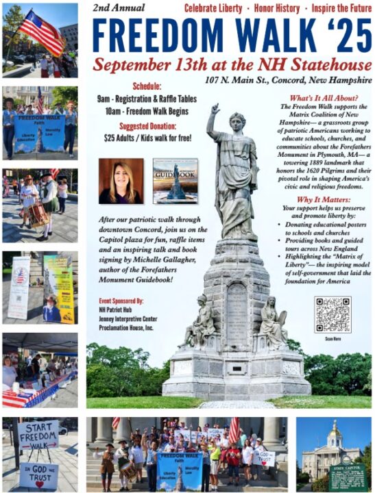 The NH Patriot Hub is sponsoring the Freedom Walk, a charity walk at the State House in Concord, NH, on September 13, 2025. It will be a 45-minute walk beginning at 10 a.m. Check-in, or day of registration, will begin at 9 a.m.
