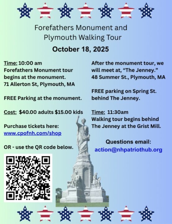 We hope you can join us on October 18th for a tour of the Forefathers Monument and the town of Plymouth, MA. Details here