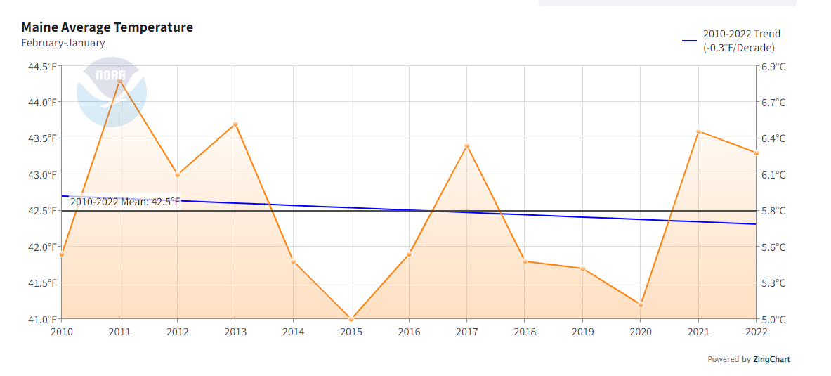 Those numbers are based on the 1900-2000 average temperature trend. As we’ve pointed out, recent data suggests the winds are changing. And while an actual 100-year average (1922-2022: 40.7 deg F., not 40.1) still results in Maine warming, it provides a more realistic look at trends and suspects as drivers.