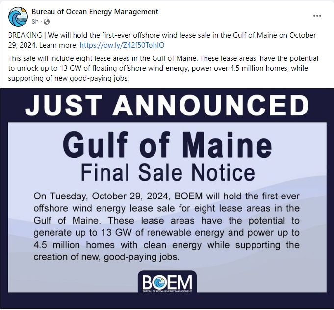 BOEM, the Bureau of Ocean and Energy Management, has announced the sale of leases in the Gulf of Maine.