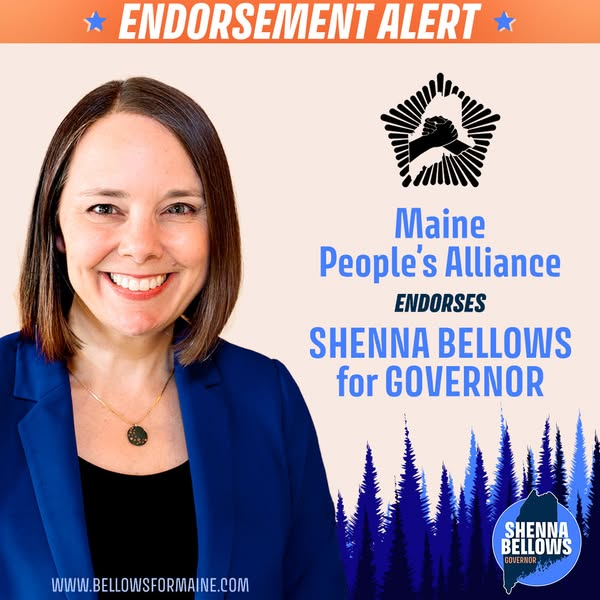 Earlier this month, Shenna Bellows — who as shown above has participated in events with Maine People’s Alliance front group COA — announced that her campaign for Maine governor is endorsed by the Maine People’s Alliance.