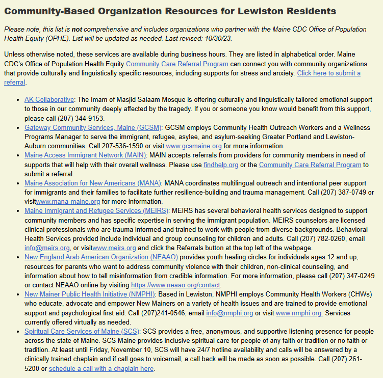 The OPHE’s Community Care Referral Program lists several partner organizations, many of which cater primarily to “New Americans,” refugees and asylum-seeking migrants in the Portland and Lewiston area.