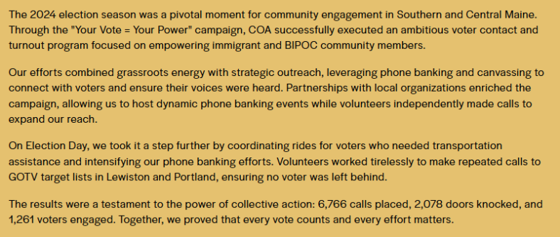 A blog post from COA below describes their “Your Vote = Your Power” program as an “ambitious voter contact and turnout program focused on empowering immigration and BIPOC community members.”