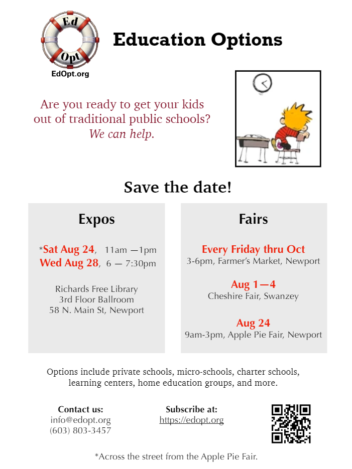 We are kicking off our first expo in Newport NH at the end of August, where people can come to talk with representatives from regional private schools, micro-schools, charter schools, learning centers, home education groups, and more.