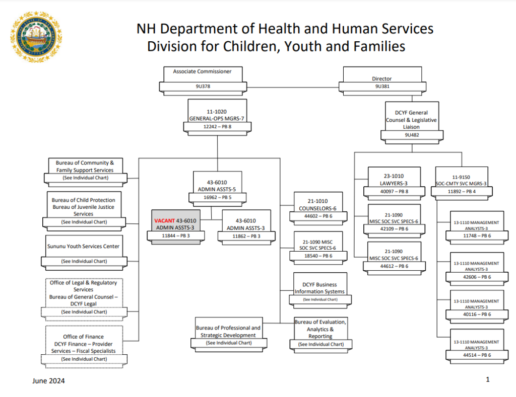 One area that needs more investigation is the NH Division of Children, Youth, and Families (“DCYF”). Given the department’s turnover (including the head honcho) this last year, I need an up-to-date Organizational Chart. While there is a “bare” organizational chart here (24 pages of it), go ahead and tell me EXACTLY what it depicts—it’s only titles, position IDs, and the like.