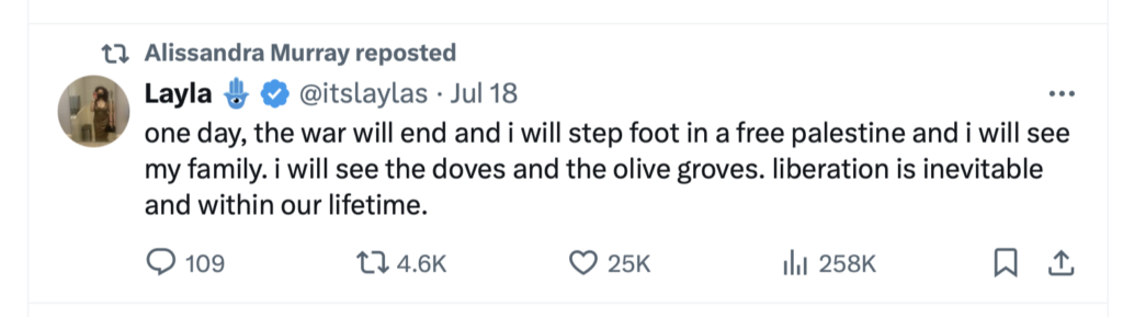It certainly appears that Alissandra Murray’s top issue … after boys playing girls’ sports, life-altering medical procedures on children, such as chemical castration, grooming children attending public schools … is the destruction of the State of Israel. “Free Palestine” is shorthand for “Free Palestine from the river to the sea,” which geographically is the entirety of Israel.