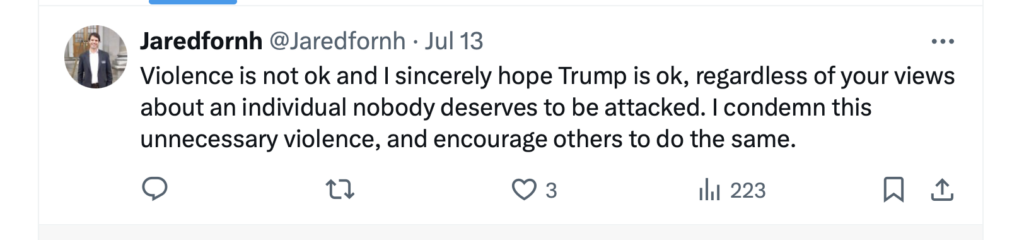 Democrat Representative Jared Sullivan condemned the attempted assassination of Trump on his X (twitter). Yet he did not call for an end to the insane, out-of-control, Trump-is-Hitler, Trump is a fascist, Trump-must-be-stopped rhetoric that Democrats have been using nonstop.