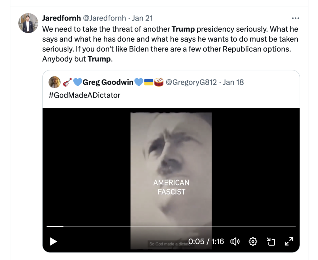 Perhaps that is because Jared has engaged in that very rhetoric … labelling Trump a fascist (albeit Jared probably has no idea what fascism is) and comparing Trump, OF COURSE, to Hitler.