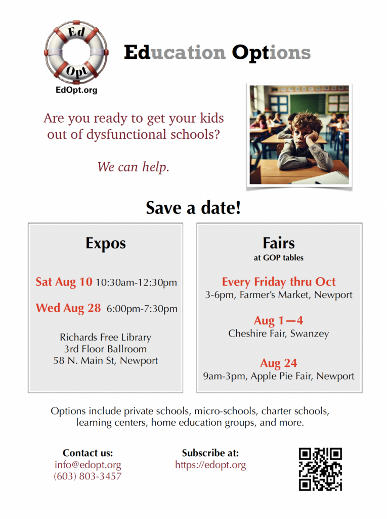 EdOpt people will also be at some Fairs (Newport Farmer’s Market and Swanzey Fair). You can find us at the GOP tables.