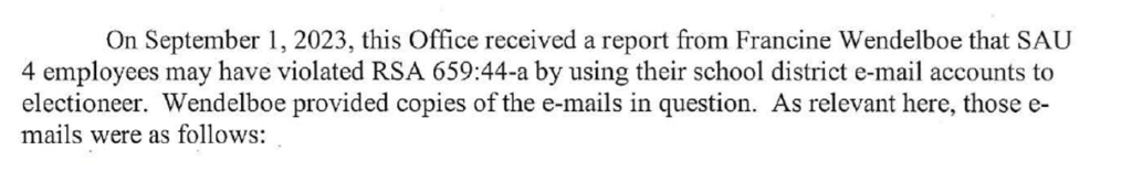 New Hampshire Electioneering Law (RSA 659:44-a) prohibits public employees from using government property to engage in voters or votes. The only thing more difficult than getting public employees, typically teacher’s union members, from doing it is convincing the AG office to prosecute. Miracles, however (it seems), can happen. After losing a School Board race by four votes, Fran Wendleboe obtained evidence of electioneering and requested an investigation and ruling by the office of the Attorney General.