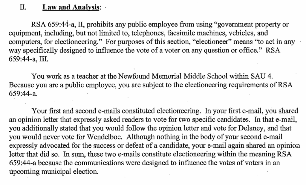 You can read the details here, but the gist is this. Newfound School District employee Erin Edwards got caught electioneering.