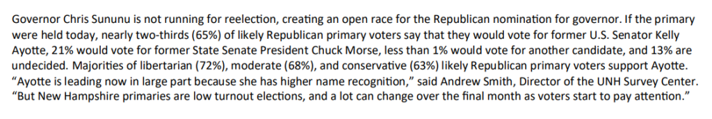 Chuck Morse supporters got some bad news this week. The latest Granite State poll is out, and Ms. Ayotte has a commanding lead among self-identified Republican primary voters. Forty-four points.