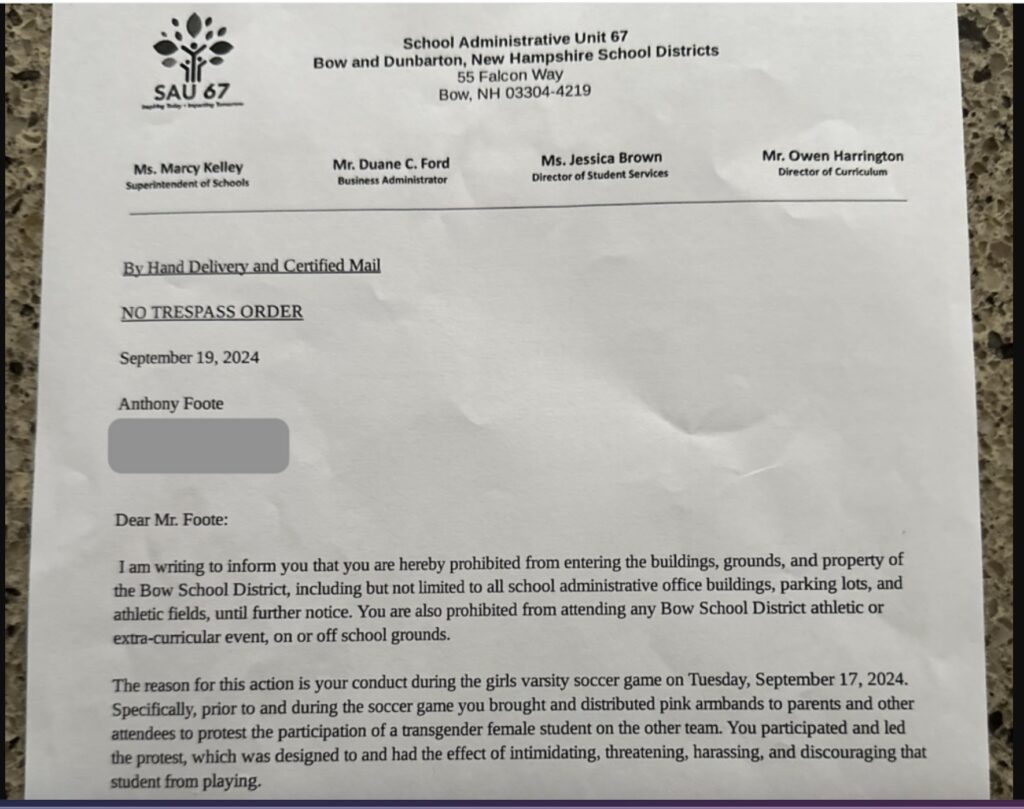 It was reported that his “daughters’ soccer team was forced to compete against a team with a biological male on the roster, and some Bow High School parents were unhappy about it. They complained to the school’s athletic director, Mike Desilets, but were told there was nothing that could be done in the wake of a federal judge’s ruling that the term “girl” includes males who identify as female.”