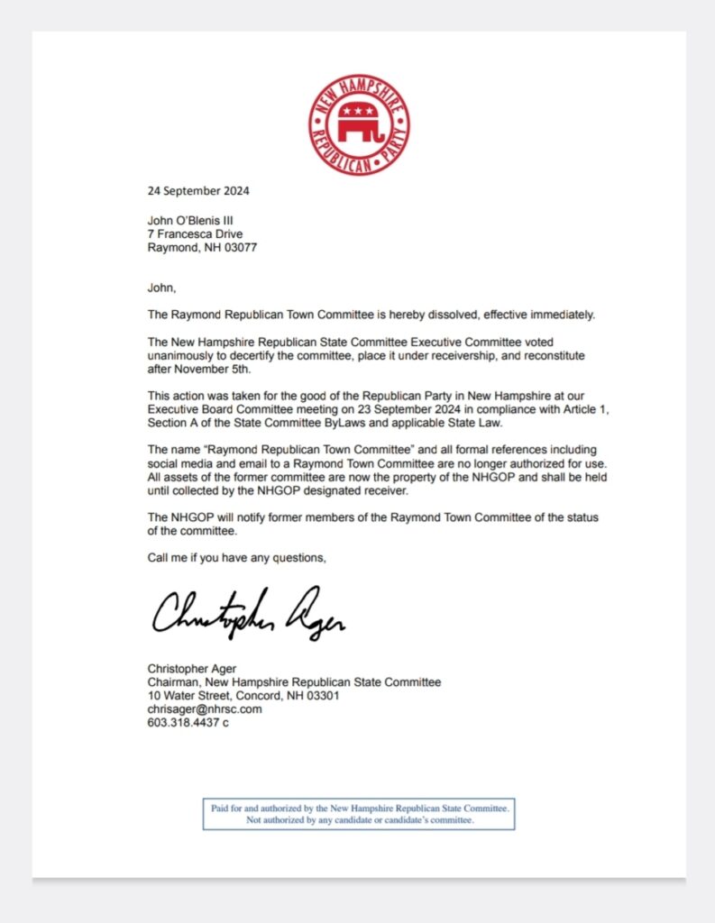 This morning, we received a copy of a letter from the New Hampshire State Republican Party to Raymond, NH Town Committee Chair John O’Blenis III, stating that his town committee had been dissolved.