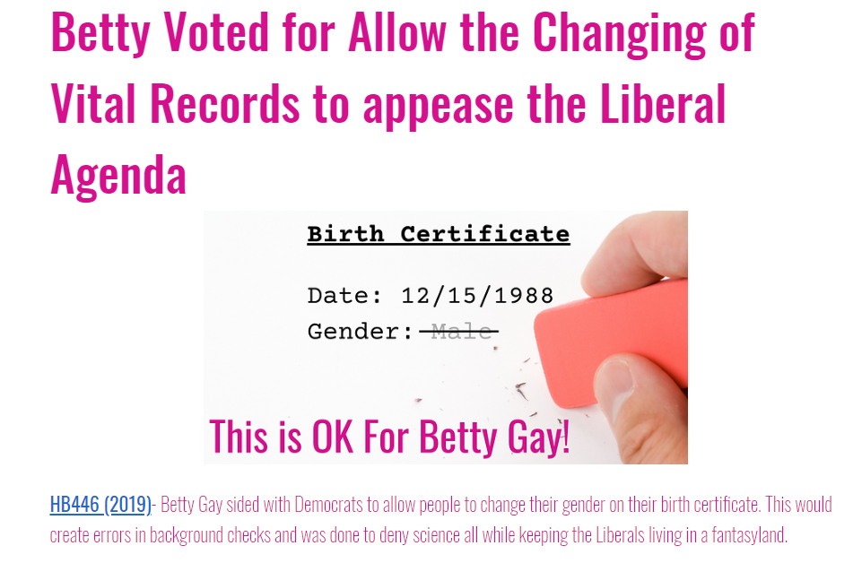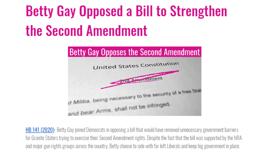 Betty’s last House Republican Alliance rating was 69.5. Her four-year average (two terms, 2016-2020) is a paltry 70%. Betty is a RINO likely to vote the wrong way on key votes like protecting Second Amendment rights or women’s sports. The folks at No Way Betty Gay say Salem doesn’t need her.