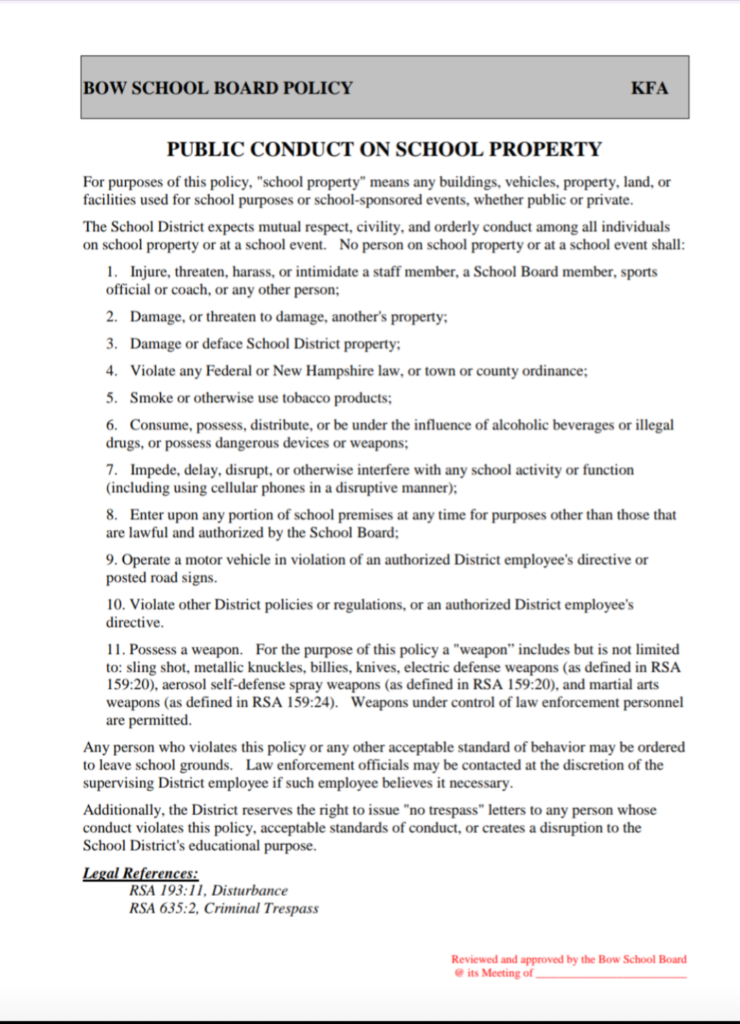 Bow’s new troubles begin with this recently unearthed document, “Public Content on School Property,” which is a fine way to say, “Please sue me some more” (if enforced as written).