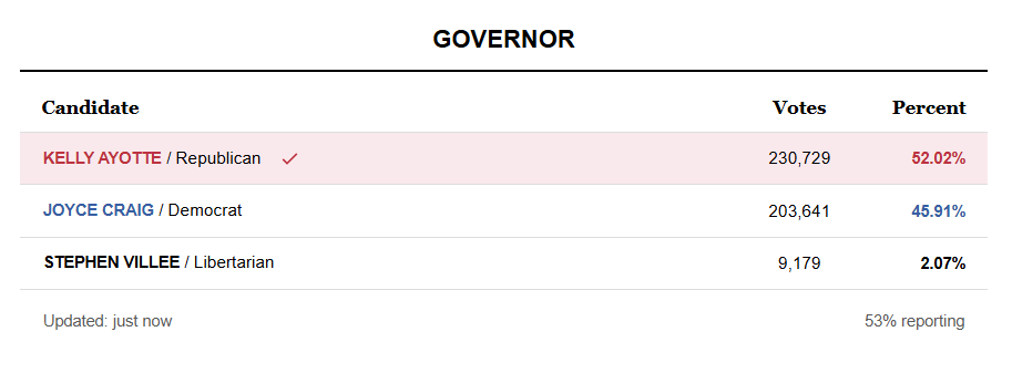 Kelly Ayotte has won the race for Governor. Joyce Craig has conceded.