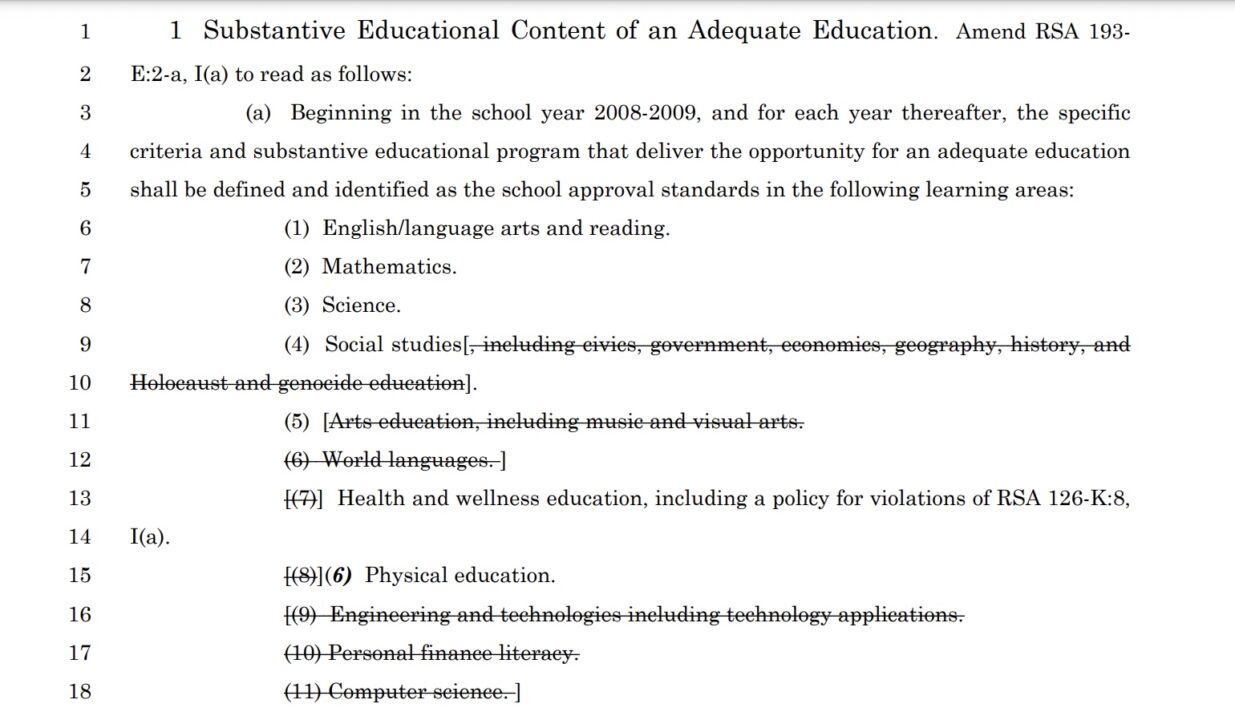 You can see how an adequate education would be defined if this bill were to pass, and be signed into law. The state would no longer require some of these subjects to be taught in a New Hampshire Public school. But just because the state eliminates these subjects doesn’t mean public schools cannot offer them. It means that the state will not require local schools to offer these courses.
