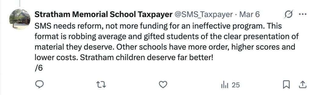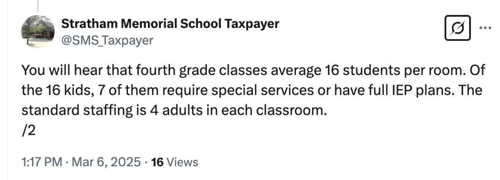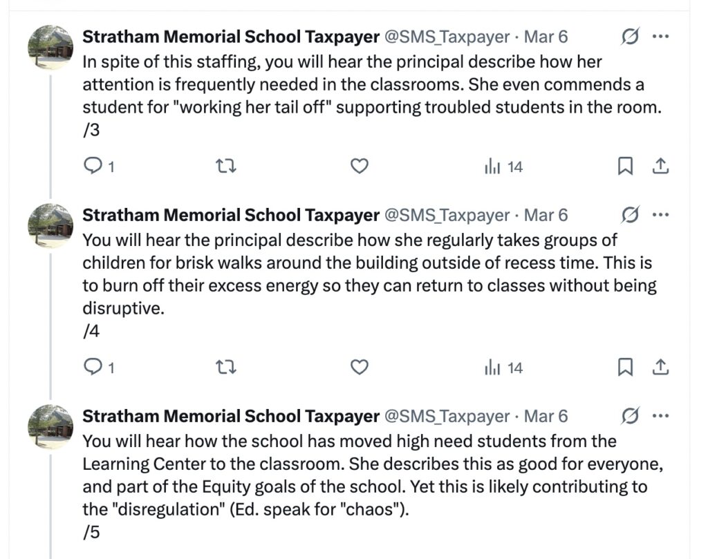 This X thread includes a video from a Stratham school board meeting, where you will hear about the conditions at Stratham Memorial. It shows both dysfunction from mainstreaming and a reactive management style that exacerbates chaos in the classroom. But more importantly, you will see why you will be forced to pay more in taxes. It’s your money.