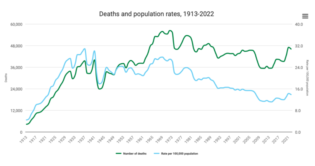 The rising quality of automobiles is reflected in vehicle fatality data. Motor vehicle fatalities per 100,000 people peaked in 1937, according to data compiled by the National Safety Council. By raw numbers, U.S. motor vehicle fatalities peaked in 1972.