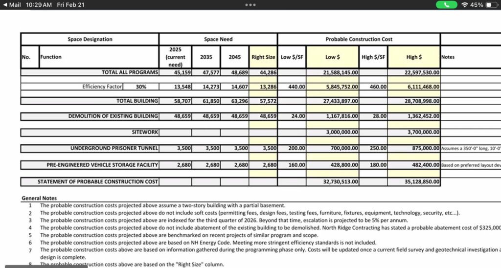 This is the cost sheet presented today to the the Grafton County Courthouse Building Committee by the architectural firm of Lavallee Brensinger which brings the Danson design (done many years ago) from 78 thousand square feet down to approximately 58 thousand square feet, and also brings the present price range down to somewhere between $33 Million to $35 Million, plus interest to be attached to the tax bills of Grafton County taxpayers.