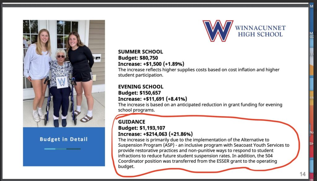 2) SAU21 will reduce suspensions using non-punitive measures by sending students who would have been suspended for bad behavior, to Seacoast Youth Services. In this year’s Winnacunnet budget, that cost to the taxpayers in SAU21 was around the $100,000.00.