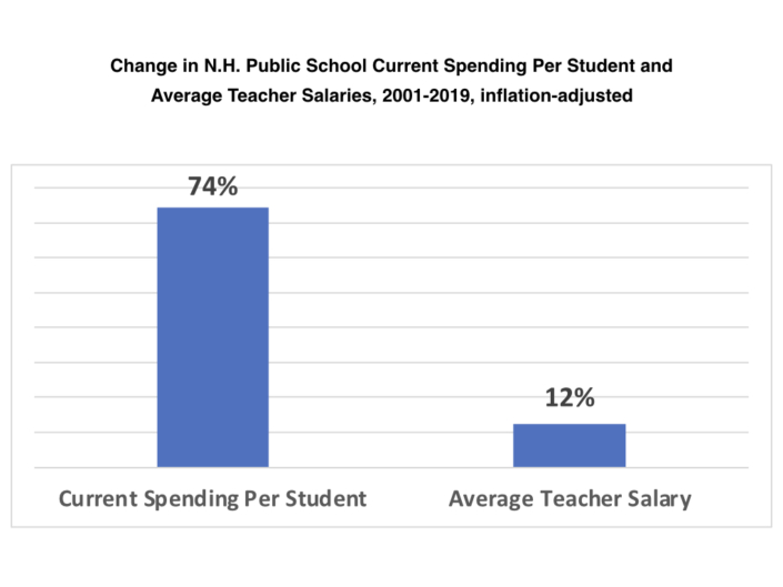 That’s the kind of increase that should lead to large leaps in teacher pay. But it didn’t. Average teacher pay in New Hampshire from 2001-2019 rose by only 12%.