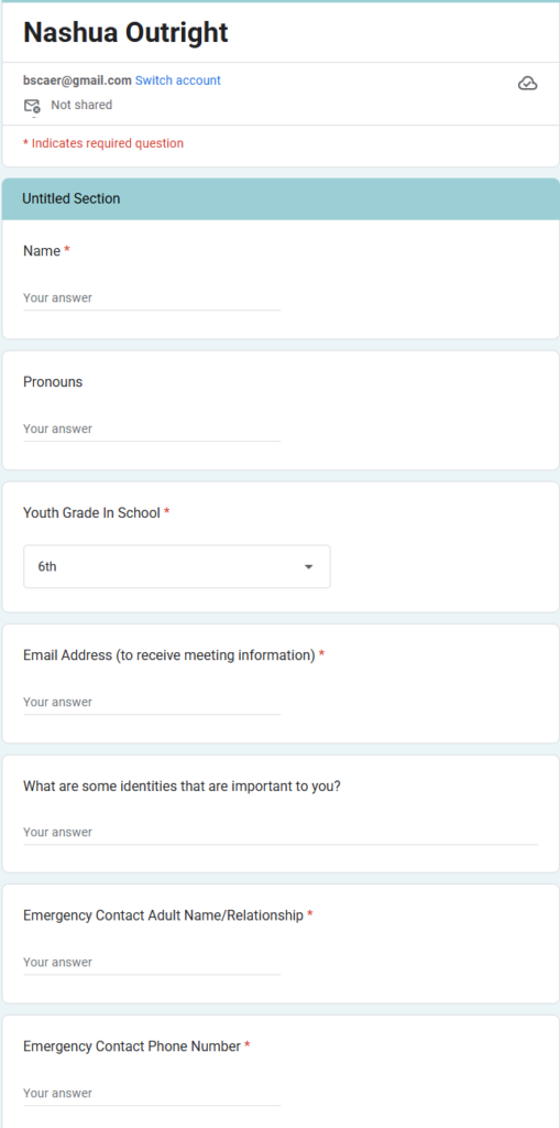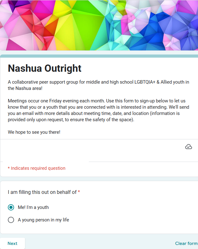 On May 16, I checked the signup form and found that NH Outright had changed it. The form now has two options, one for children and one for parents, and the child’s option requests an adult’s contact information. It is a little better. At least now, there is a chance that the parents will be notified that their child is in contact with unknown people at NH Outright who want to talk to them about their sexuality and gender identity.