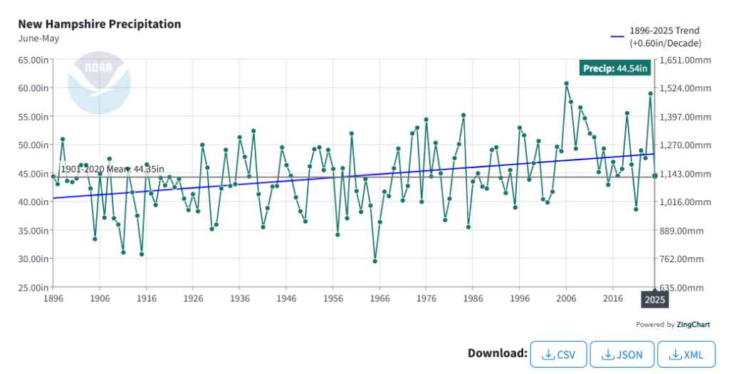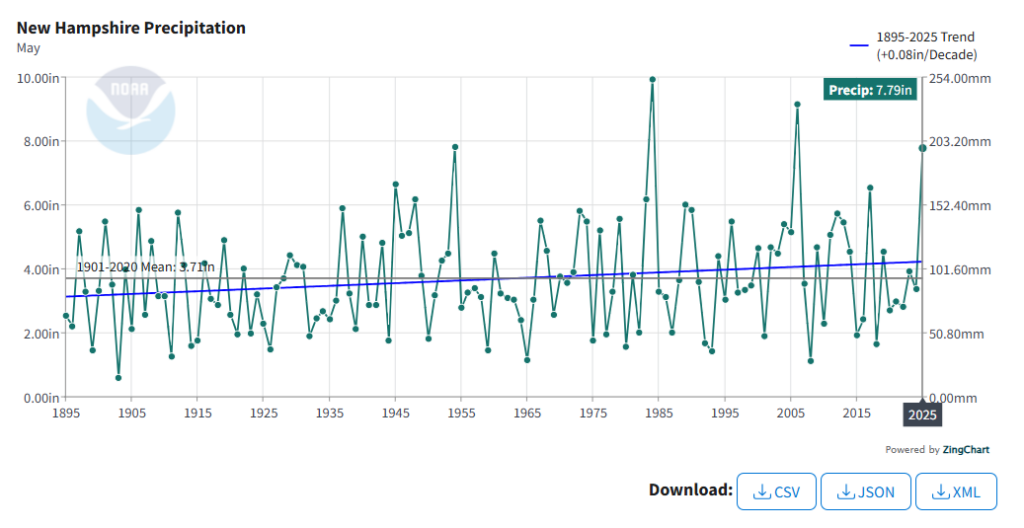 May 2025 was the fourth wettest on record for New Hampshire—nearly 8 inches of rainfall, well above the 120-year mean and the trend.