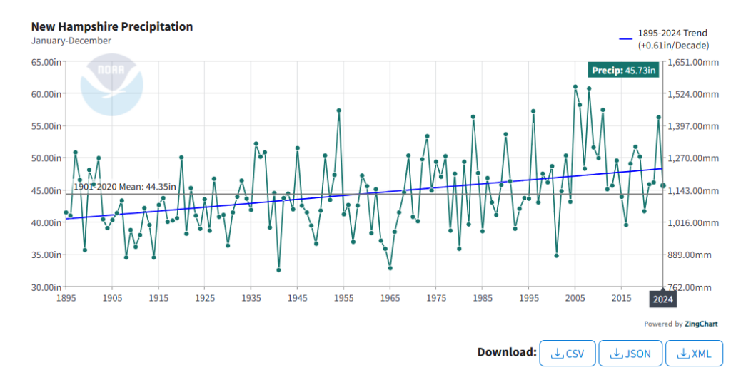 This is an amusement and a meaningless statistic because we don’t “count” it like that. We calculate these things by calendar year. And in 2024, New Hampshire had 45.73 inches of rain, above the mean but below the trend.