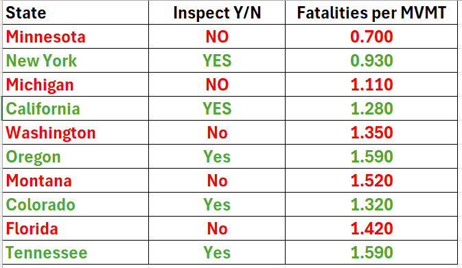Here’s a handful of states with and without mandatory state inspections and their Fatalities per million vehicle miles traveled (MVMT)