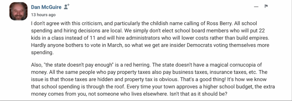 Steve MacDonald was kind enough to share “RINO-Russ Barry” (a/k/a State Rep Ross Berry) Is Gaslighting You About “Local Control” And Property Taxes on his Granite Grok blog. Thank you, Steve! We noticed that State Rep Dan McGuire didn’t like our posting. We’ll share his criticism below, and then respond.