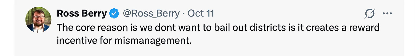 No objective or neutral observer would characterize the foregoing as a “bailout.” Claremont is not receiving $5 million in additional funding or even five cents in additional funding. Claremont receives zero additional funding. Claremont simply gets early access a portion of its “adequacy grant” that the State is obligated by statute to pay.