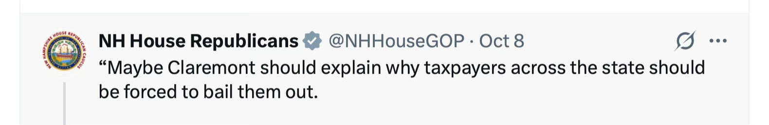 As for RINO-Russ’ speculation about what the “next legislature” might do, it also might pay off Claremont’s entire deficit if Ward’s amendment is not passed. Speculation about what the “next legislature” might do or might not do is not a credible reason to oppose or support Ward’s amendment.